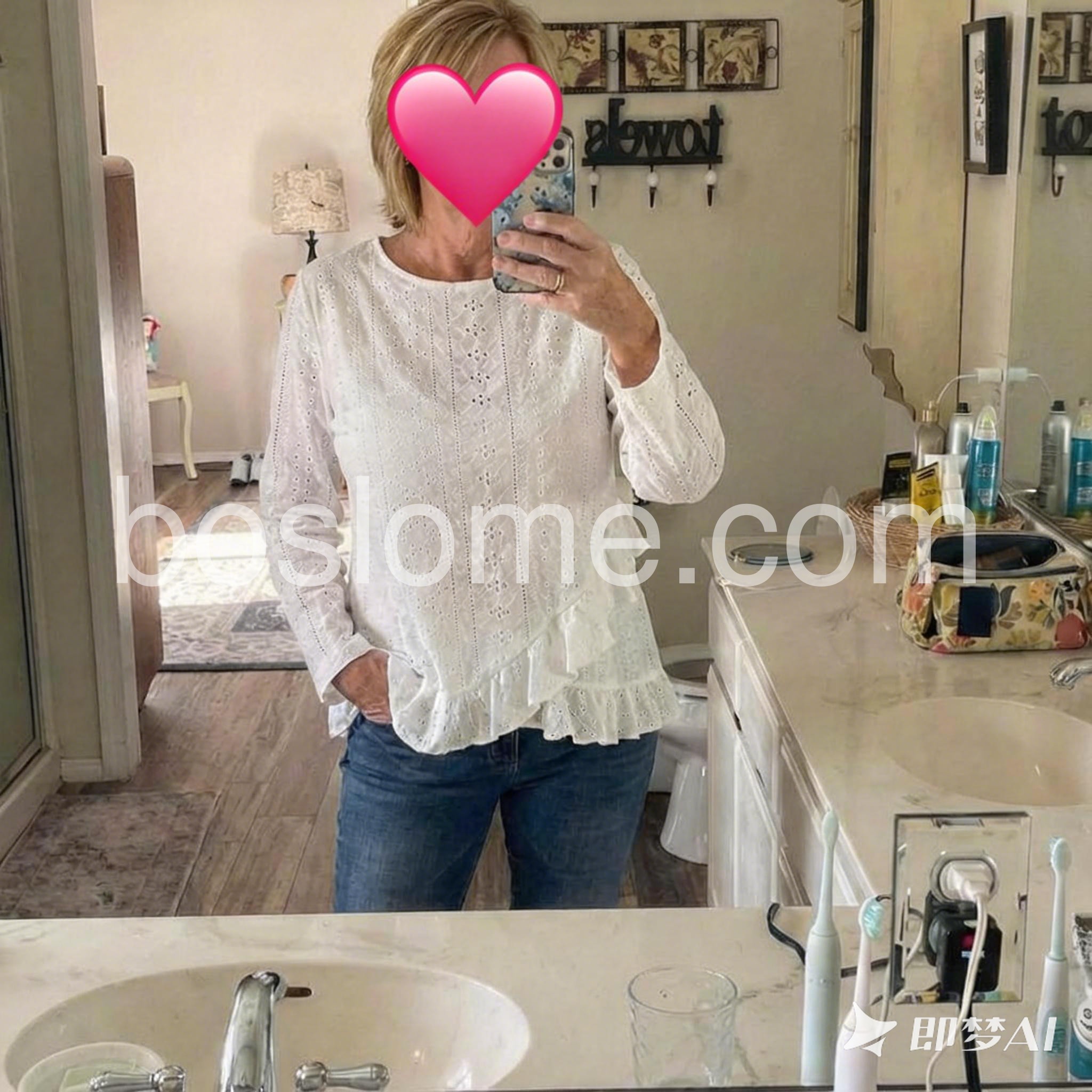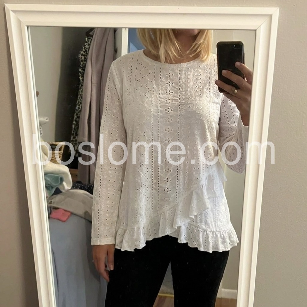 My new favorite white shirt! It elevates a simple outfit instantly. The delicate ruffles and intricate cutouts make it stand out from basic tops.