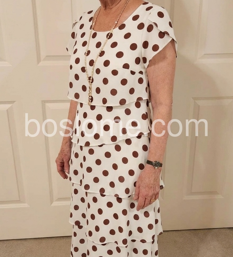 The short, ruffled sleeves offer gentle coverage, and the round neck keeps the look classic. The tiered design solves the problem of “shapeless dresses” by adding texture and dimension.