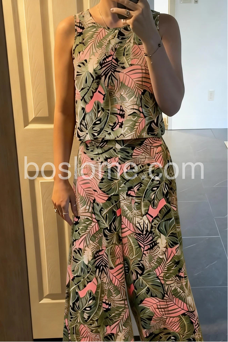 Thisย coordinated setย features a sleeveless crop top and wide-leg pants in a bold tropical leaf print. The mix of green, pink, and black creates a lively summer vibe. Lightweight fabric for comfort and ease. Perfect for beach days or casual outings. Effortlessly stylish with a nature-inspired flair.