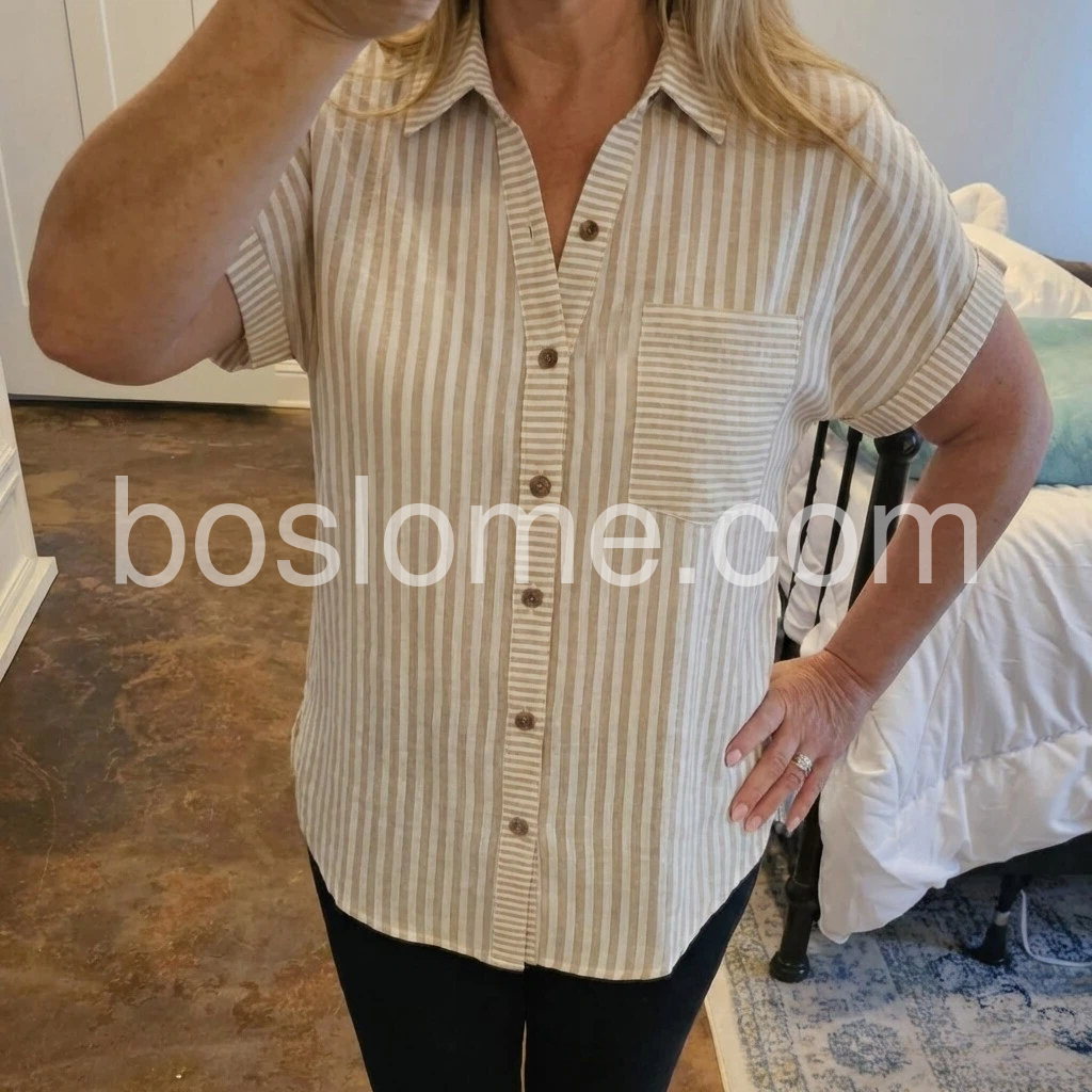 This short-sleeve shirt features vertical brown and white stripes with a classic collar. Front button closure and chest pocket add practical style. Soft, lightweight fabric for all-day comfort. Perfect for casual wear or layering. Effortlessly chic and easy to pair.