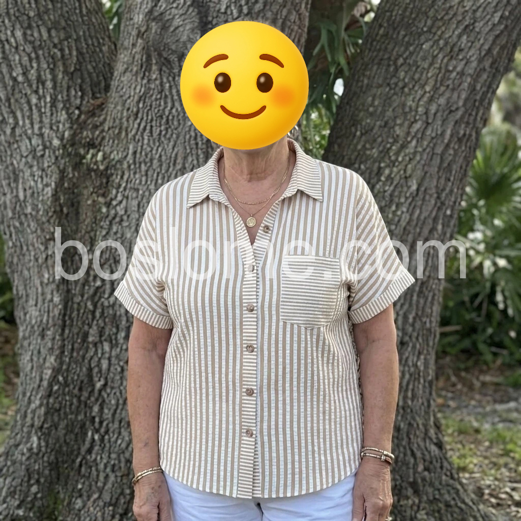 This striped button-down is absolutely perfect for summer! The material is lightweight and breathable, and I love the contrast of the horizontal stripes on the pocket. Fits true to size.
