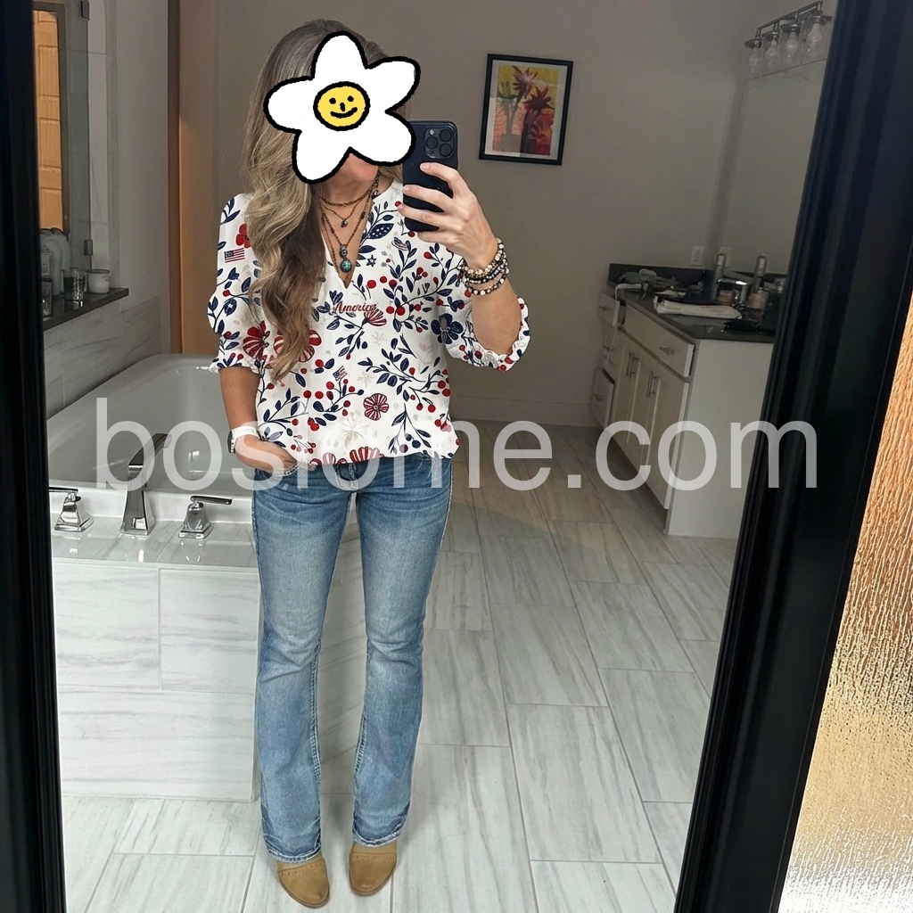 Patriotic Floral Print 3/4 Sleeve Blouse