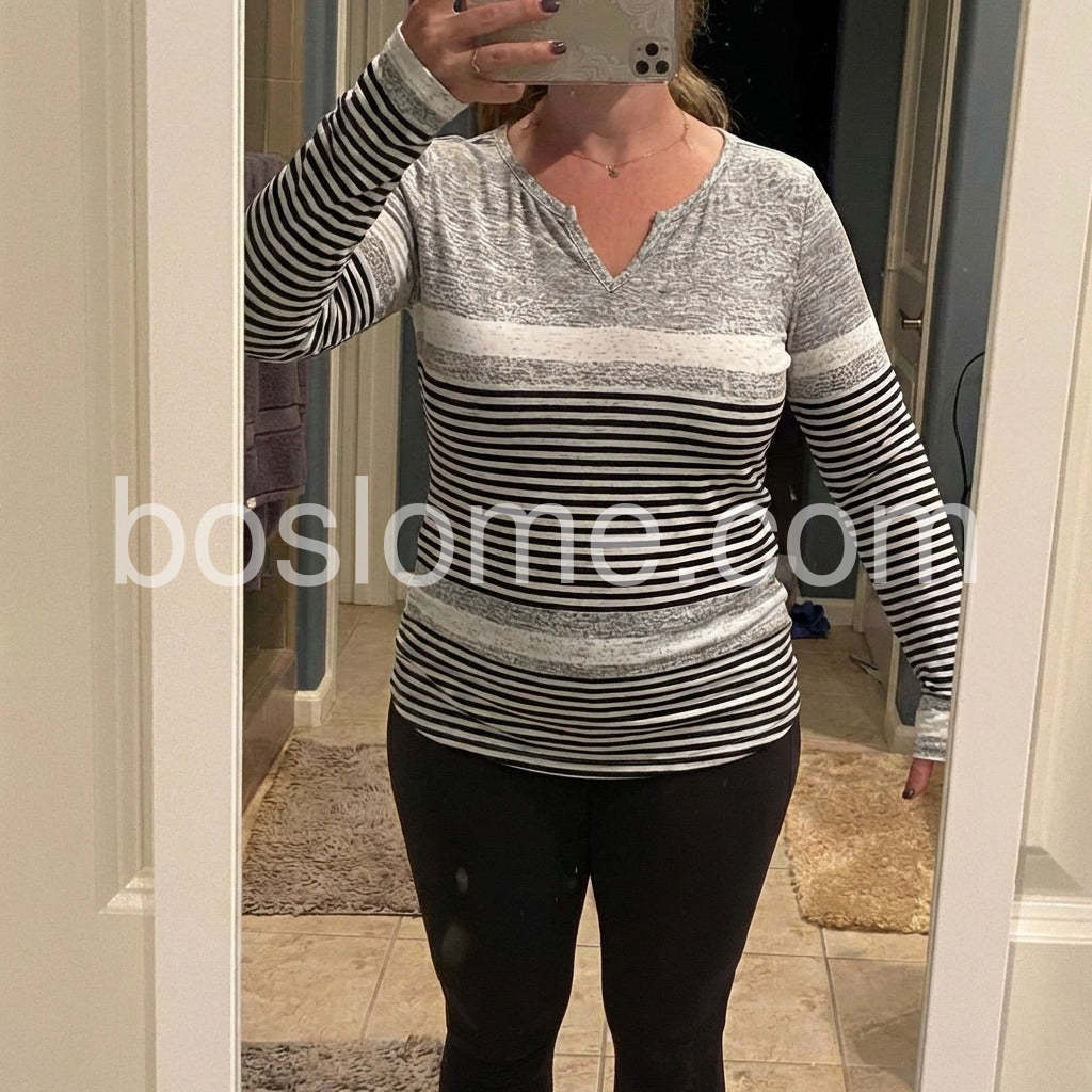 This Youthful Notched Neck Striped Print Long Sleeve Top combines a modern silhouette with timeless style. Designed with a distinctive notched neckline and classic horizontal stripes, it offers a refined yet casual look. The long sleeves provide comfort and versatility, making it a practical choice for layering or standalone wear. Ideal for everyday sophistication, this top complements both relaxed and polished outfits with ease.