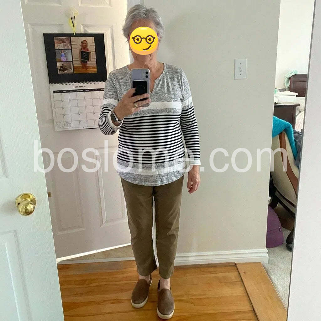I absolutely love this top! The color block design with the stripes is so unique and flattering. The material is very soft and comfortable for all-day wear. It looks great paired with my favorite jeans.