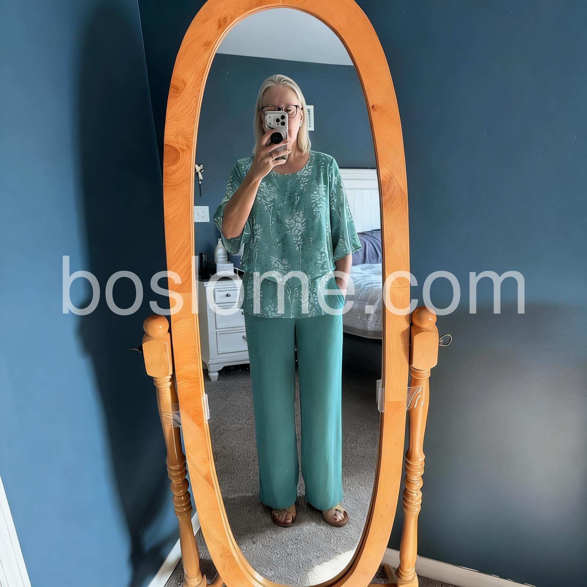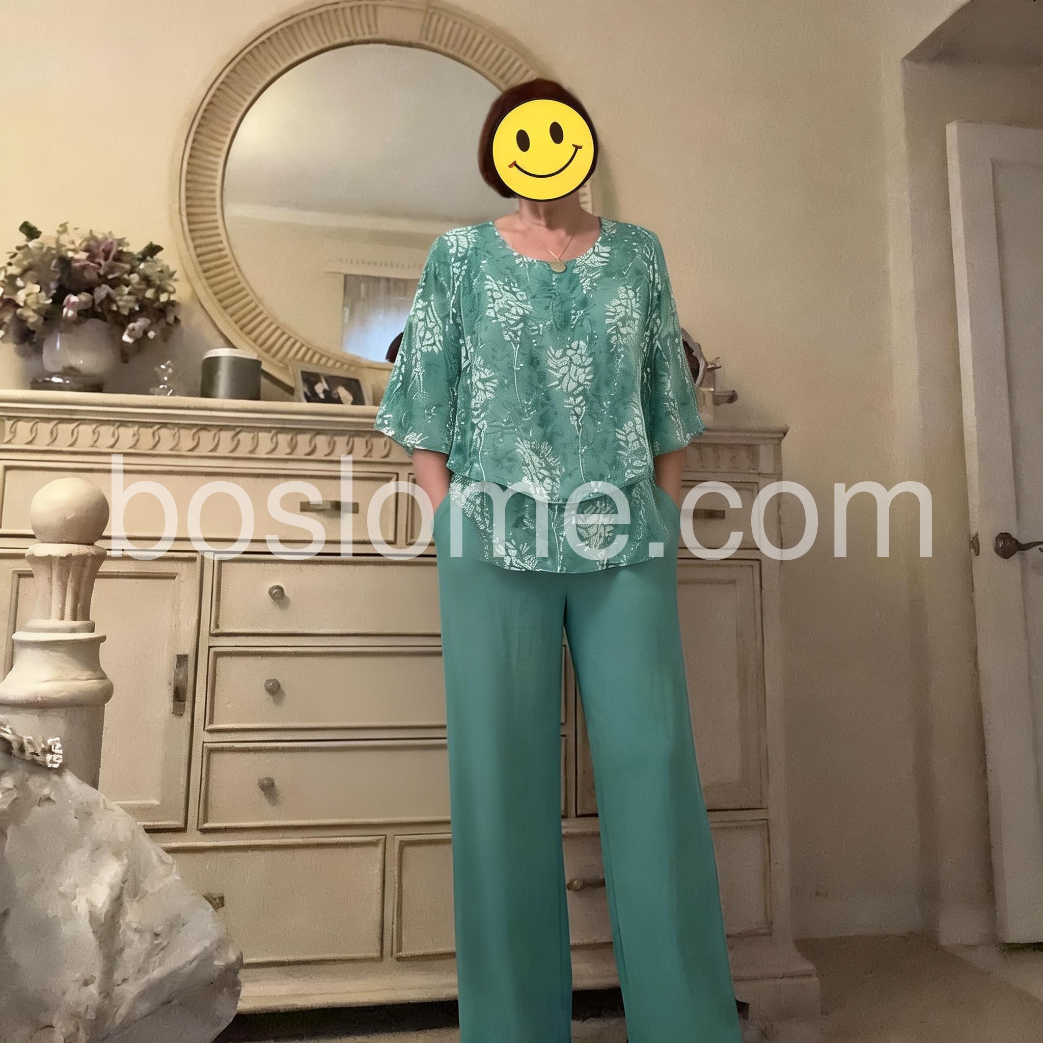 Thisย coordinated two-piece setย features a flowy floral-print top with flared sleeves and a layered hem. Paired with solid teal wide-leg pants for a relaxed silhouette. Lightweight fabric perfect for warm days. Ideal for casual outings or everyday wear. Elegant and effortless.
