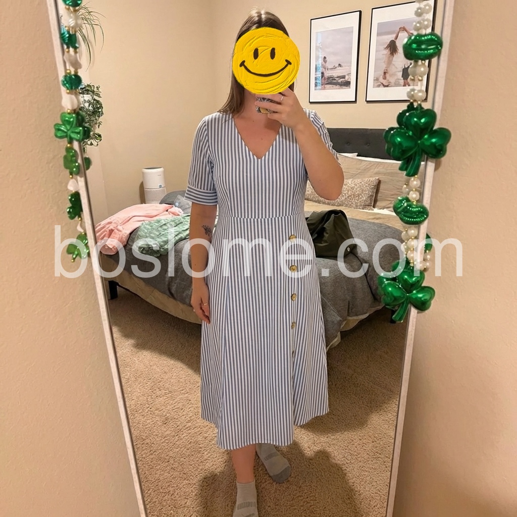 This midi dress reimagines classic nautical stripes with modern, feminine style. The crisp blue-and-white print and V-neck create a timeless, fresh look.