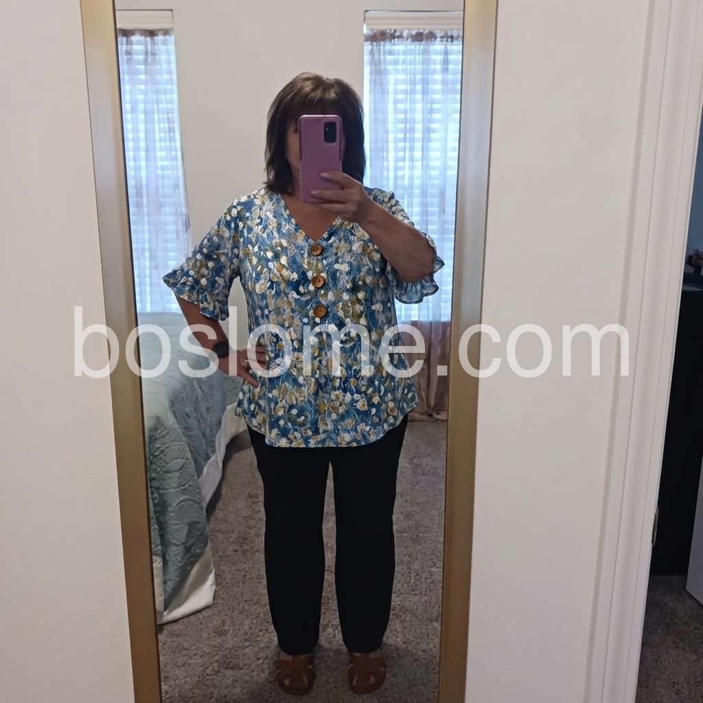 I absolutely love the blue floral pattern on this top! It fits perfectly and the flowy design completely hides my tummy area. The material is very lightweight and perfect for spring.