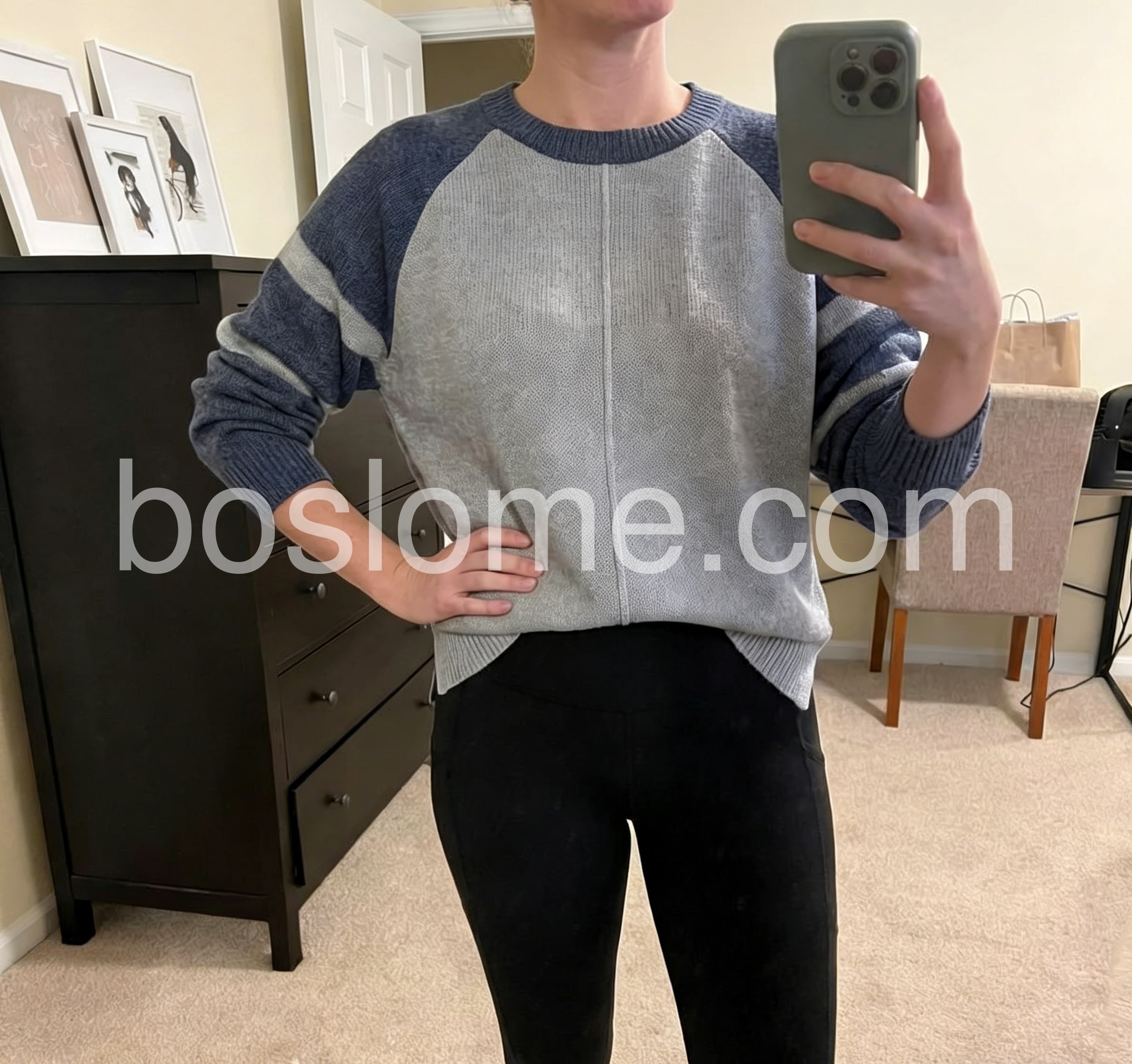 I’m obsessed with this color-blocked sweater! The contrast between the light gray body and dark blue sleeves adds a trendy touch, and the subtle stripe on the sleeves elevates the look. The material is lightweight yet warm, making it ideal for layering. It’s soft against the skin and the fit is relaxed and comfortable. It’s quickly become my favorite piece for casual outings and weekend brunches!
