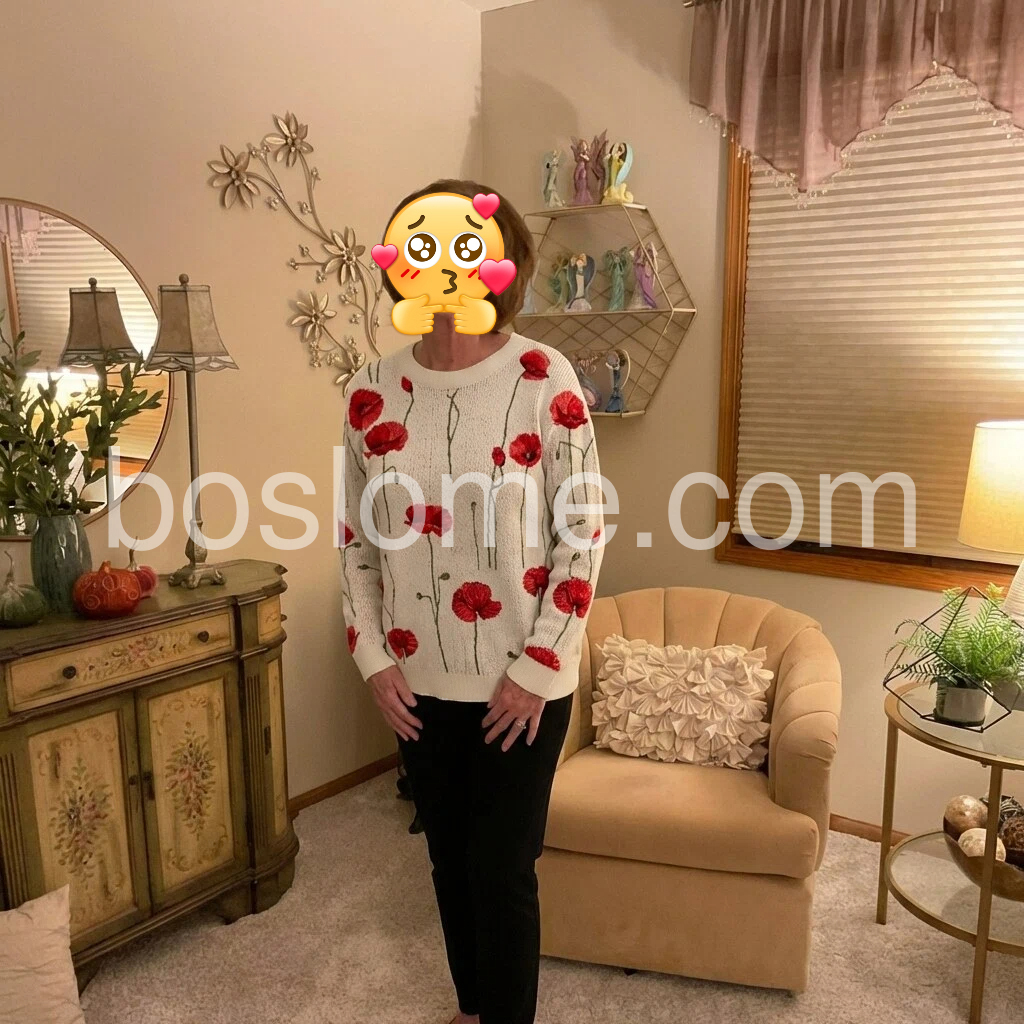 This poppy print top is absolutely beautiful! The vibrant red flowers stand out so nicely against the soft cream color, and the stitching looks so detailed and well-made. The fabric is cozy and lightweight, perfect for layering in spring and fall. The curved hem adds a cute, unique touch, and I’ve gotten so many compliments on how artistic and eye-catching it is. I’m in love!