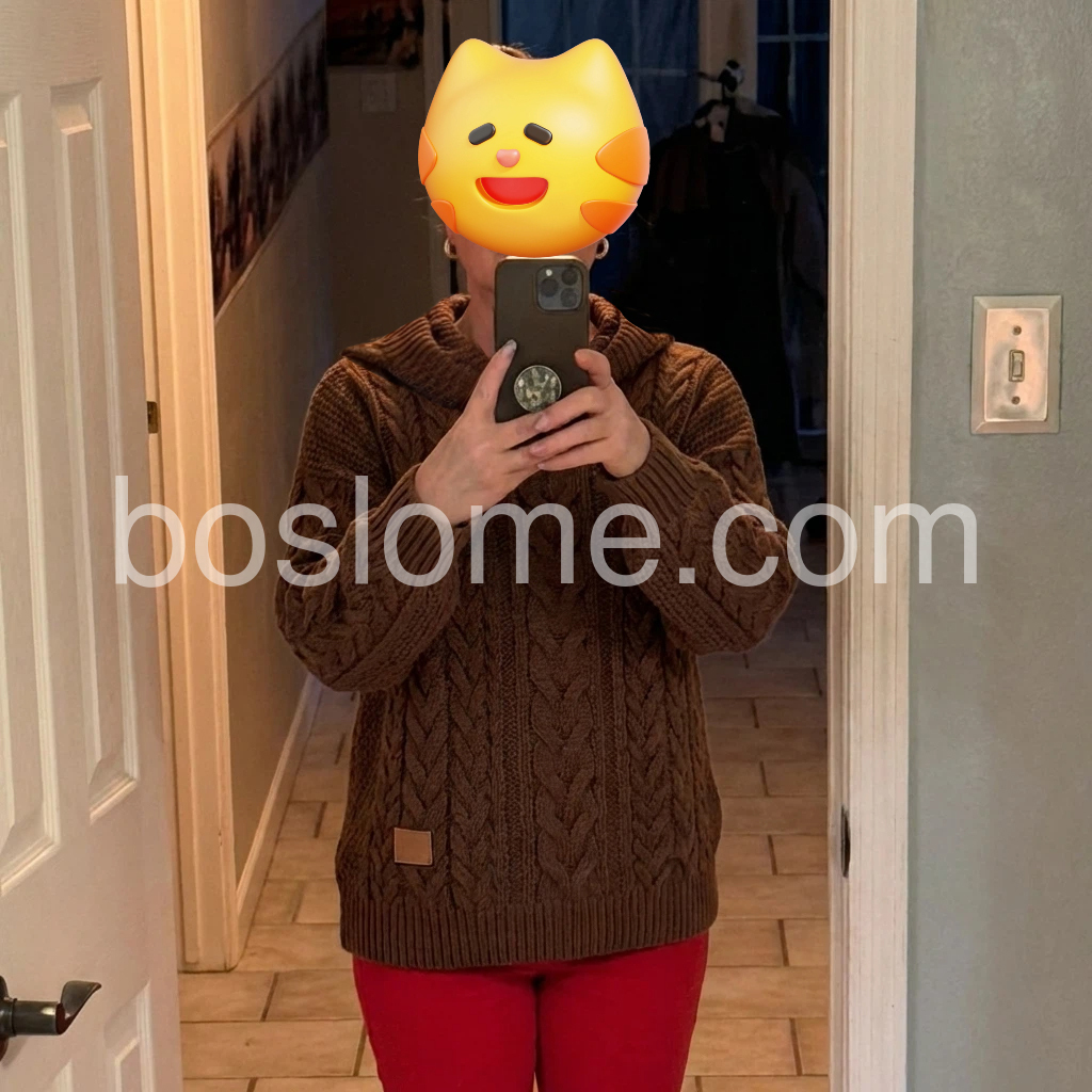 This cable knit sweater is so cozy and stylish! The cowl neck keeps me warm on chilly days, and the oversized fit is perfect for layering. The fabric feels thick and well-made, and the little leather tag adds a nice rustic touch. It’s quickly become my favorite go-to for fall and winter.