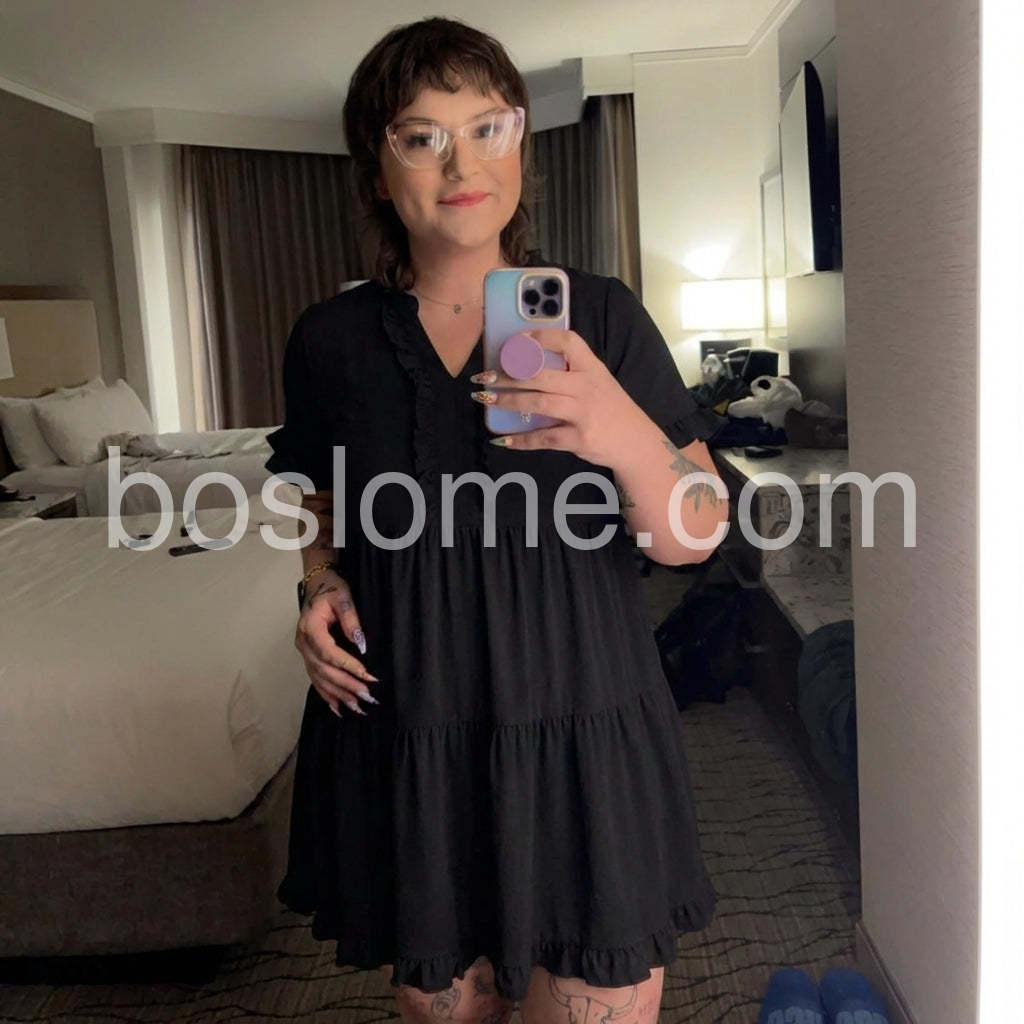 Style# 1544556Elevate your everyday look with this Black Tiered Ruffle Short Sleeve Mini Dress, a charming and feminine silhouette that blends timeless elegance with modern comfort. Crafted from soft, lightweight fabric—likely satin or crepe—with a subtle sheen, this mini dress features a flattering V-neckline adorned with delicate ruffles that add a touch of romance and detail. The short flutter sleeves are finished with matching ruffled edges, enhancing the dress’s playful yet sophisticated vibe. A tiered skirt design creates gentle volume and movement, making it perfect for casual outings, brunch dates, or relaxed social gatherings. The mid-length hem offers versatility, while the flowy fit ensures ease and comfort all day long. Paired here with a statement necklace and a structured tote, it strikes the perfect balance between chic and effortless. Whether you're running errands or meeting friends for coffee, this black dress brings grace, style, and understated glamour to any occasion.